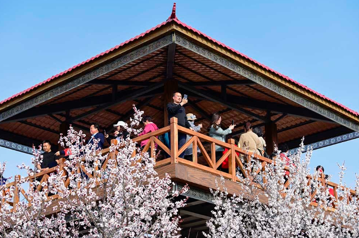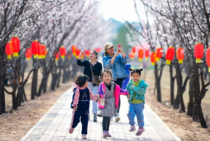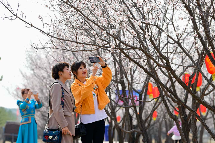 近年来,内蒙古自治区鄂尔多斯市准格尔旗依据当地独特的自然条件,利用荒山秃岭,采取“公司+基地+农户+经纪人”的模式,大力发展杏树种植业,累计种植杏树林80万亩,形成绿树花海生态景观,吸引许多游客到这里游览,让农牧民走上新的致富路。图为2021年4月9日,游客在鄂尔多斯市准格尔旗第六届乡村旅游杏花季活动中赏花。(摄影:王正)