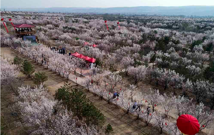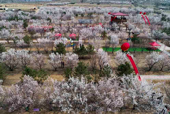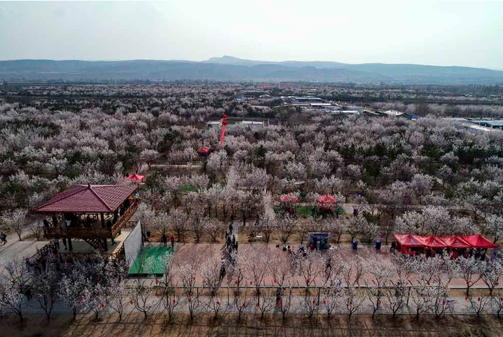 2021年4月9日,无人机在鄂尔多斯市准格尔旗第六届乡村旅游杏花季活动中拍摄的杏树林。(摄影:王正)
