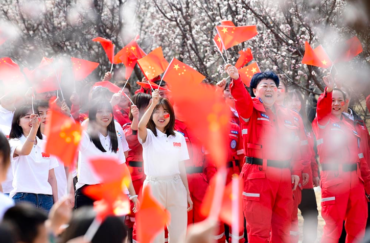 2021年4月9日,游客在鄂尔多斯市准格尔旗第六届乡村旅游杏花季活动中参加《爱我中华》快闪。(摄影:王正)