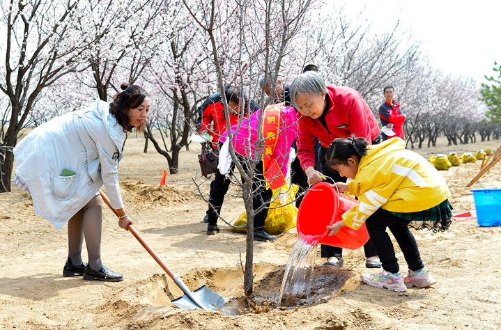 2021年4月9日,游客在鄂尔多斯市准格尔旗第六届乡村旅游杏花季活动中栽种杏树。(摄影:王正)